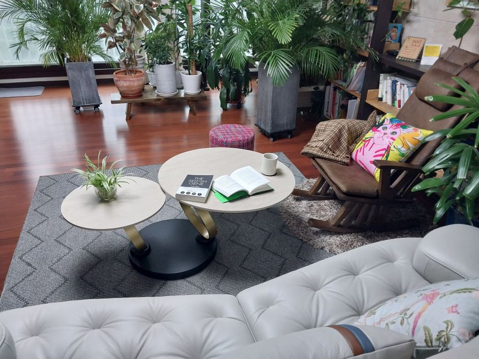 전체적으로 월넛 톤이라 조금 어두웠던 거실이 이 테이블 덕분에 마법처럼 환해졌어요. 밝은 컬러의 트라버틴 천연석 느낌으로 디자인된 세라믹 상판이 고급스러운 우아함을 더해주고, 식물들과도 너무 잘 어우러져 거실 분위기가 훨씬 생기 있어졌습니다.