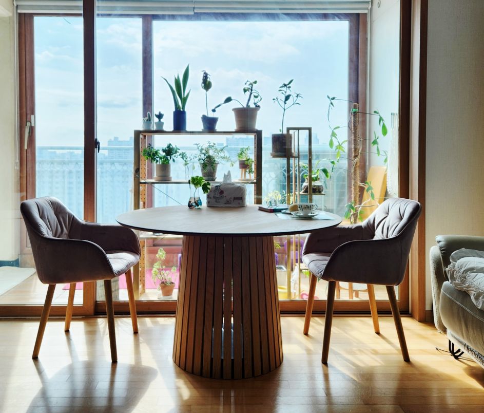 밝은 햇살에 은은한 원목과 연보라 벨벳 의자가 저를 더 집순이로 만들었어요^-^