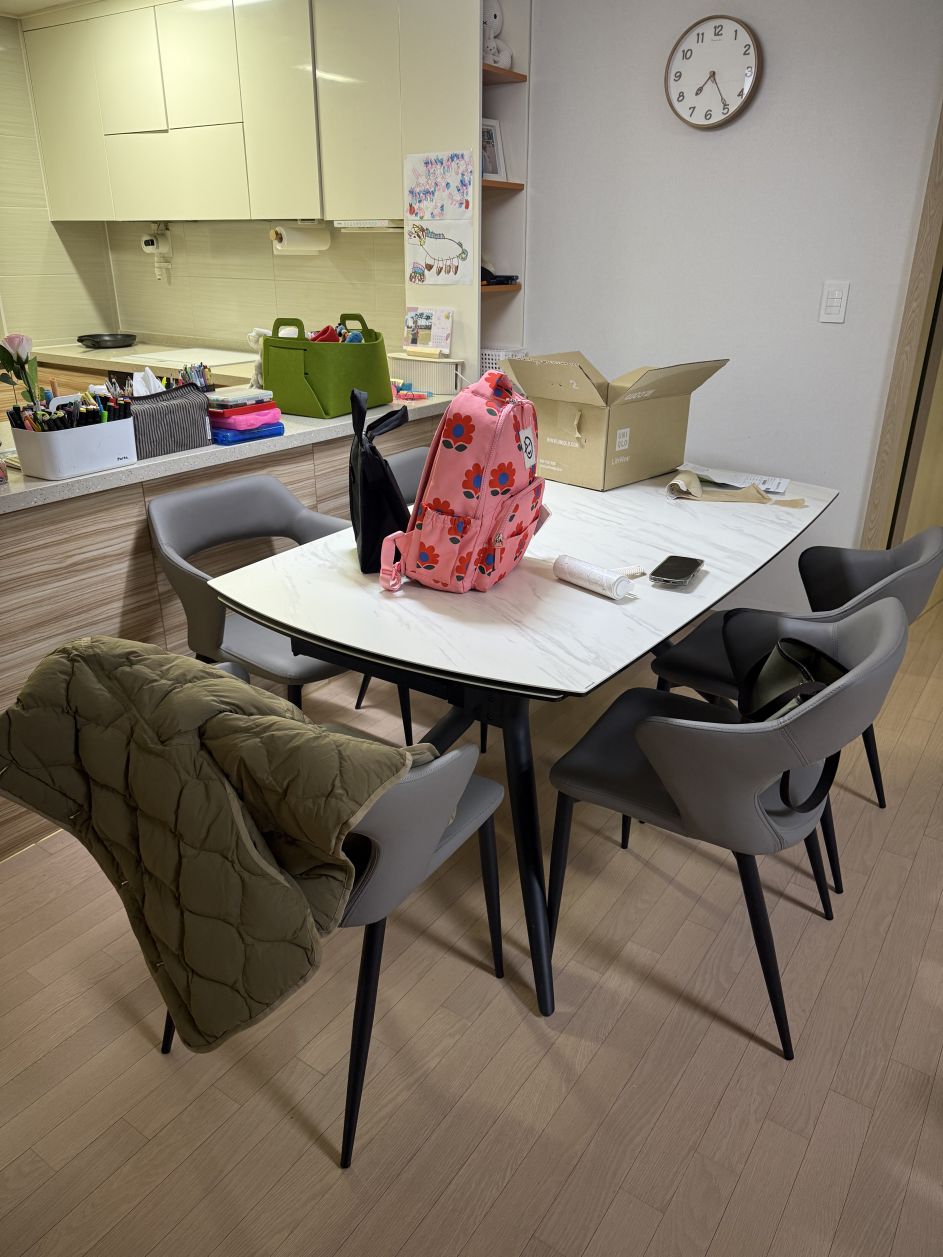 식탁입니다. 그냥 둬도 작지 않은 크기이고 늘리면 어마 무시 합니다…. 그래도 나름 거실이 큰 스타일의 아파트인데 완전 집이 꽉차는 느낌입니다 ㅎㅎㅎ 치우지 못하고 부랴부랴 사진을 찍었네요… 미라지 가구 추천합니다!! 완전!!!