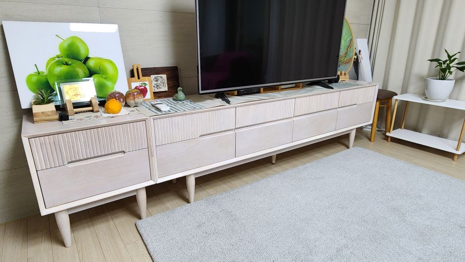 TV 사이즈랑 딱 맞춘 것처럼 안정적이고, 수납 공간이 넉넉해서 거실의 잡동사니들이 싹 정리됐어요. 높이가 적당해서 TV 볼 때 시선도 편해요