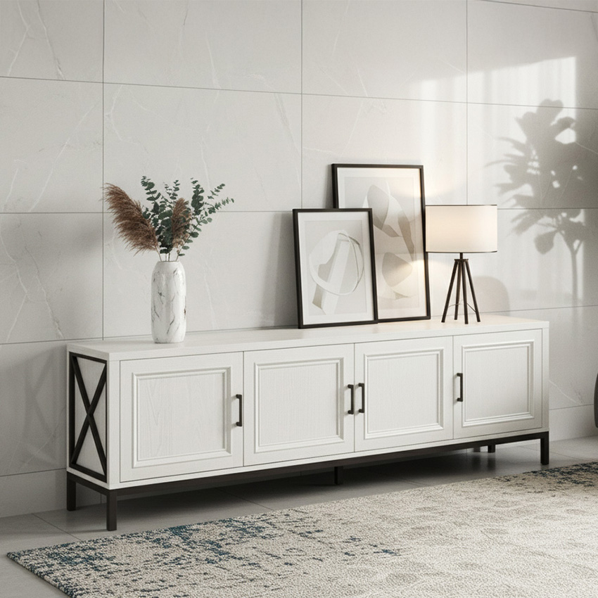 단순한 듯 보이지만 귀티나는 거실장입니다. 나뭇결이 은은하게 비치는 하얀 칠과 단아한 손잡이, 흰색과 대비되는 검정색 받침대, 옆면의 엑스자 받침 등이 어울려 품격있는 거실을 만들었네요. 토요일 길이 막혀 좀 늦었지만 끝까지 책임있게 설치하시고 뒷처리까지 깔끔하게 마무리해주셔서 감사합니다. 거실장 때문에 다른 가구들도 미라지 알아보고 있습니다.